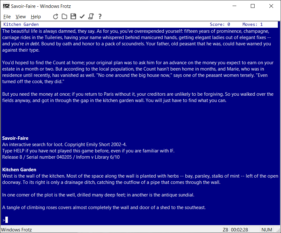 Here are two screenshots of the interpreter in action: first Emily Short's Savoir-Faire, and then Infocom's Zork Zero.