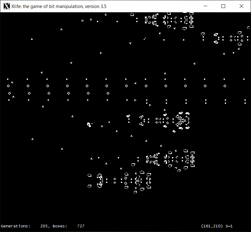 Here you can download my port of Xlife 3.5 to Windows. This is a basic port, using a simple, custom X11 library to provide a user interface identical to the Unix original. Source code is also available, and there is a screenshot of Xlife 3.5 in action.